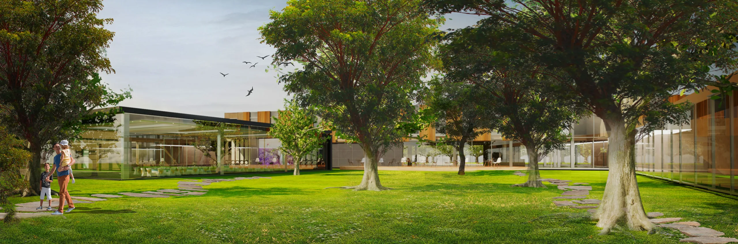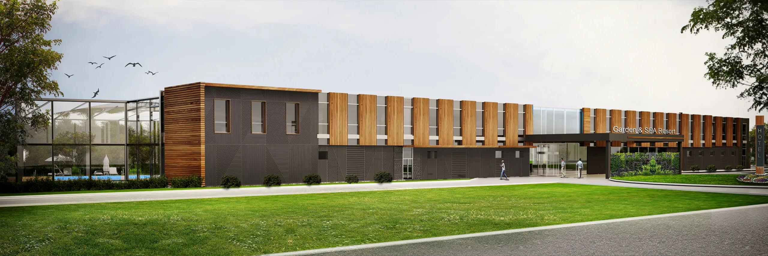 Концепція проєкту передбачає принцип унікальної для заміських комплексів регіону архітектури – сучасної, з мінімалістичним дизайном, в еко-стилі (використання скляних фасадів, а також природних матеріалів, зокрема дерева). Завдяки скляним рішенням реалізується основна ідея заміських комплексів – інтеграція в природу, об’єднання зовнішнього і внутрішнього просторів готелю в єдине ціле. При цьому з метою оптимізації інвестицій в проєкт, використання скляних фасадів закладається тільки в тих місцях, де воно концептуально необхідне. Це фасади, що виходять безпосередньо у парк комплексу або з видами на внутрішні дворики об’єкту. Саме така архітектура створить унікальний продукт (атмосферу) на ринку і дозволить стимулювати великі продажі, тобто окупить витрати на будівництво.