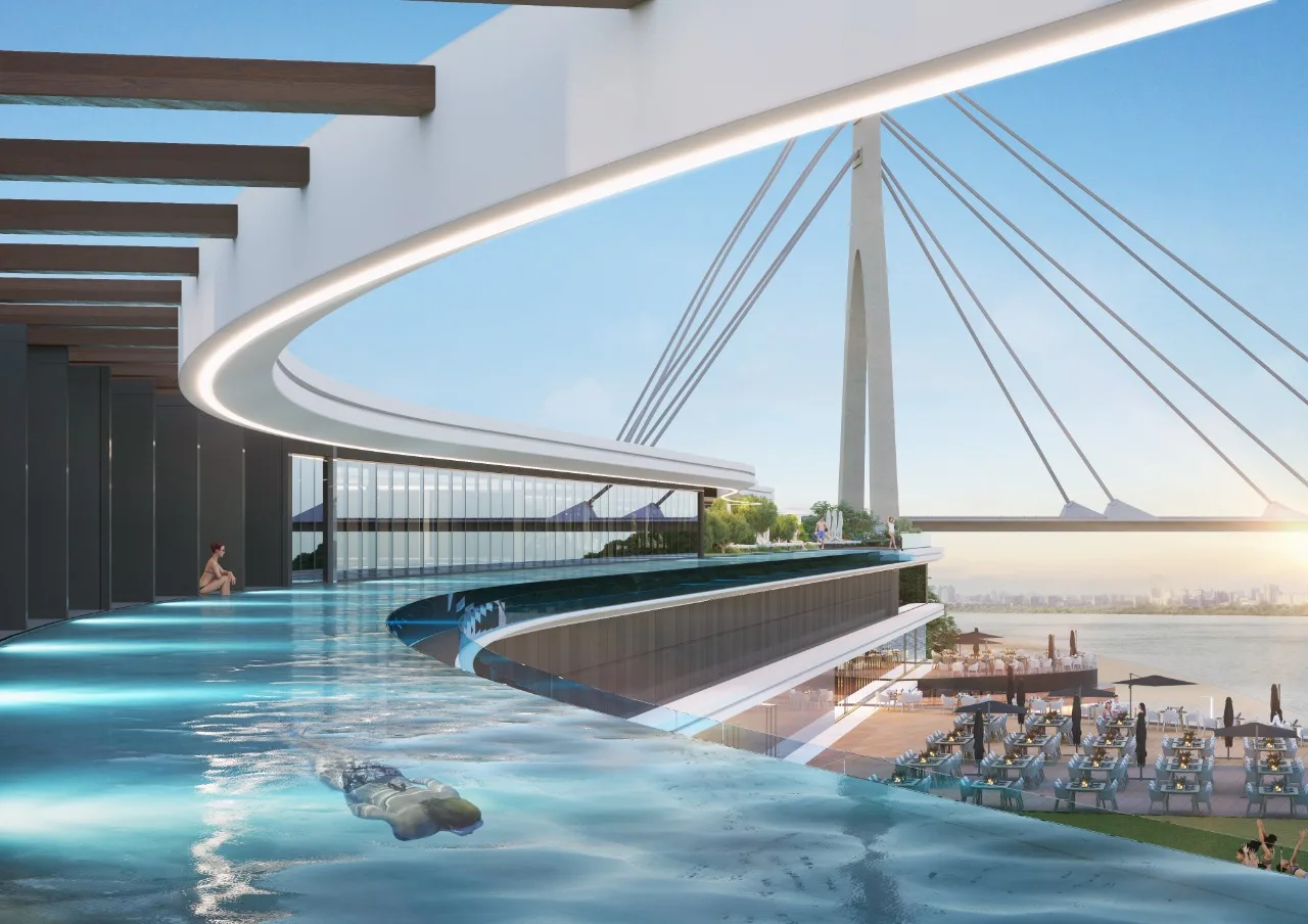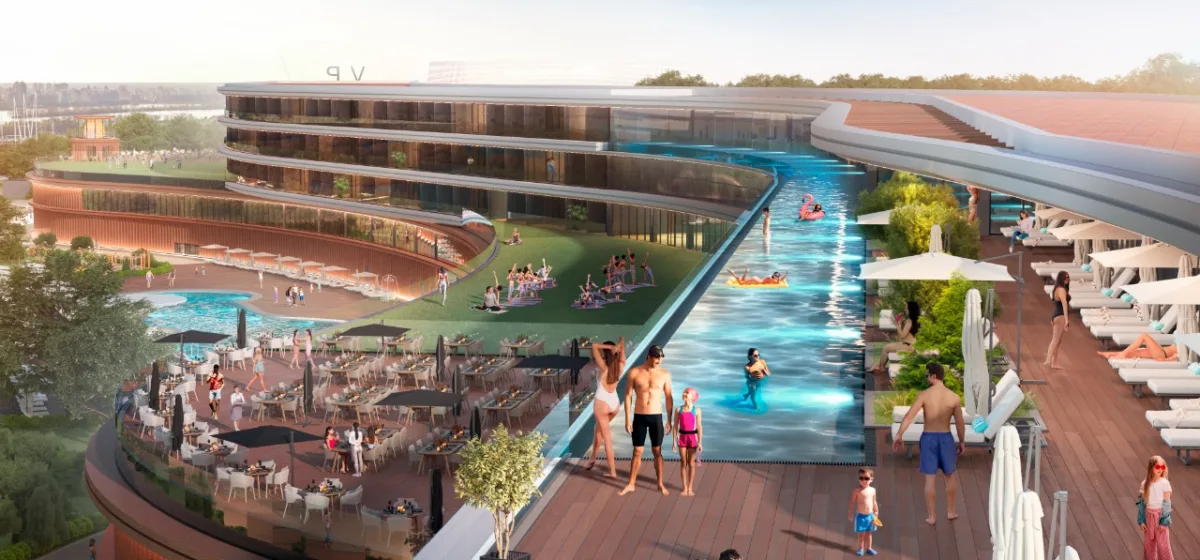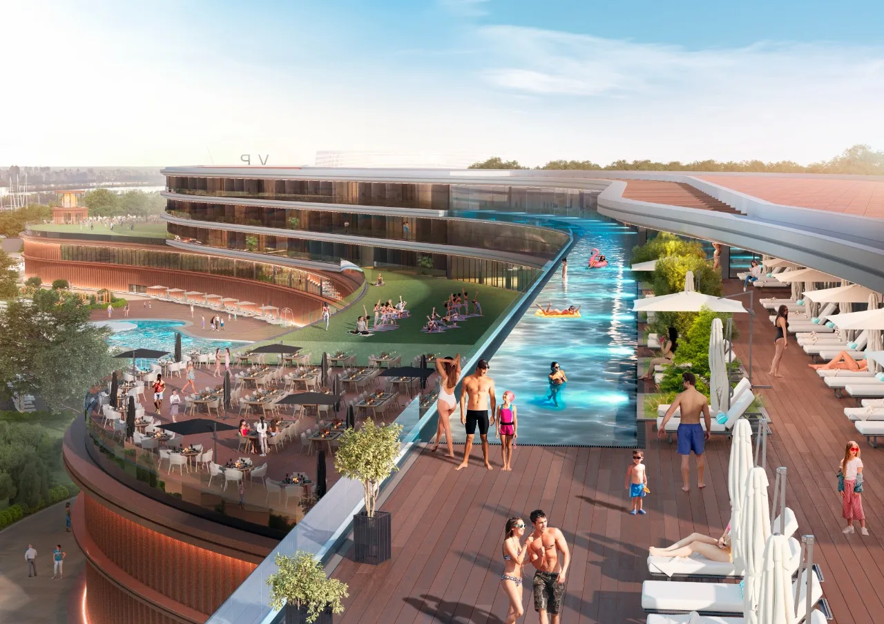 готель (5*), SPA-комплекс з панорамним інфініті басейном, казино з театром розваг та кабаре, арена (концертний зал), яхт-клуб, ресторани, нічний клуб з басейном та високим водоспадом, міський пляжно-прогулянковий пірс (взимку – ковзанка під відкритим небом), 180-градусний маяк, велика паркова зона та паркінги.